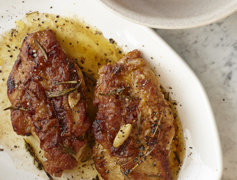 4. Transfer the chicken to the oven and cook until the skin is very brown and crispy, about 5 minutes. Remove from the oven, flip the skin side up, and add the butter, thyme, rosemary, and garlic (or divide between the 2 skillets). Return to the oven and cook until the chicken is just cooked through, about 3 minutes. Drain the chicken on paper towels briefly before serving hot.